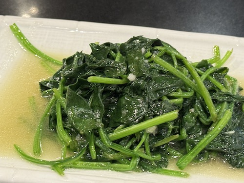 마늘과 함께 갓 조리된 뜨끈한 공심채 볶음이 맥주 안주로 제격이었다.