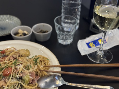 무국 무국적식당에서 갓김치 파스타와 와인 한 잔.