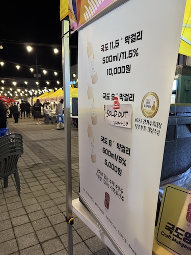 금호타이어 같은 동네 카센터 가라지에서 열리는 공연도 지나쳤는데, 그 분위기가 무척 좋아보였다. 하지만 배고픔을 이기지 못하고.. 저녁거리를 사러 잣고을 광장에 들렀다. 부스를 막 정리하는 국도막걸리에서 6도짜리를 하나 샀다. 옛날통닭도 하나 사서 카라반으로 복귀.