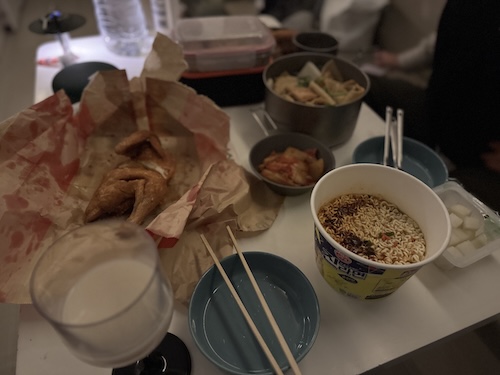 원래는 오늘 낮에 돗자리에서 마셨어야할 술들인데, 뒤늦게 카라반에서 마시게 되었다. 경기장에서 먹었던 샌드위치 이후에 첫 식사라 허겁지겁 먹었다. 쑥갓까지 챙겨와 오뎅탕을 끓여주고 참기름과 들깨가루를 넣은 두부김치까지 준비해준 짜요가 고마웠다. 와인 한 병을 챙겨 밖에 나가 불멍까지 하며 하루를 마무리했다.