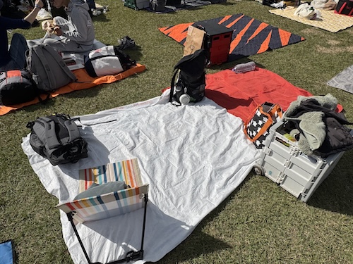 타이벡으로 만든 돗자리를 가져가봤다. 나중에 집에 와서 세탁을 하려고 보니 비에 젖은 잔디가 잔뜩 묻은 것이, 타이벡은 파쇄석 위에서만 써야겠다 생각했다.