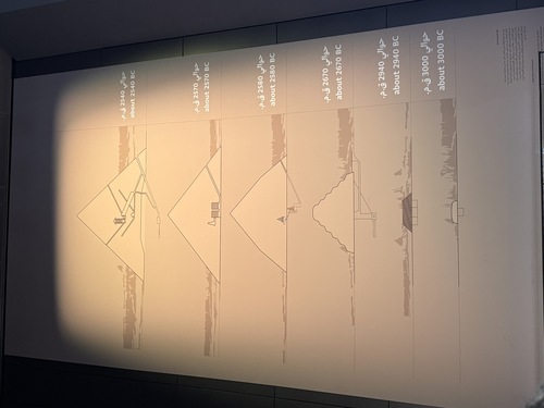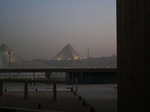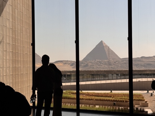 회랑의 끝에 다다라 3층에 올라서면 저 멀리 기자의 피라미드가 보인다. 피라미드가 보이는 측면을 모두 개방해두어 전시실 내부에서도 피라미드 뷰를 보며 앉아있을 수 있었다.