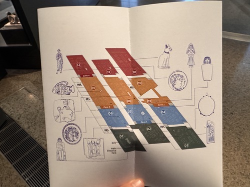 전시실 지도. 색상은 연대를 구분하고 가로축은 각각 Society, Kingship, Beliefs로 구분. 원하는 테마에 맞춰 천천히 전시실을 구경할 수 있는 동선이었다.