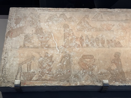 빵과 맥주의 생산. 사카라에서 발견된 기원전 2400년의 석회암 조각.