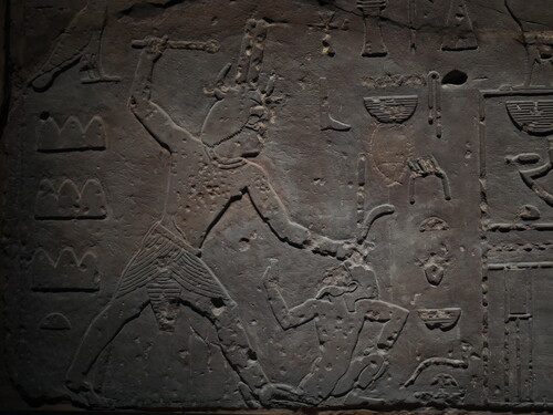 Wadi Maghara에서 발견된 스네프루 왕이 외적을 때려눕히는 조각상. 이후 수천 년 동안 변하지 않고 반복되어 사용된 모티프의 원형을 보는 기분이었다.