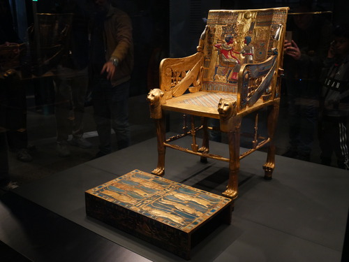 등받이엔 왕비가 투탕카멘의 몸에 향유를 발라주는 모습이 그려져 있고, 풋스툴엔 잡혀온 포로들이 그려져 있어 발아래 놓이게 되어있는 의자.