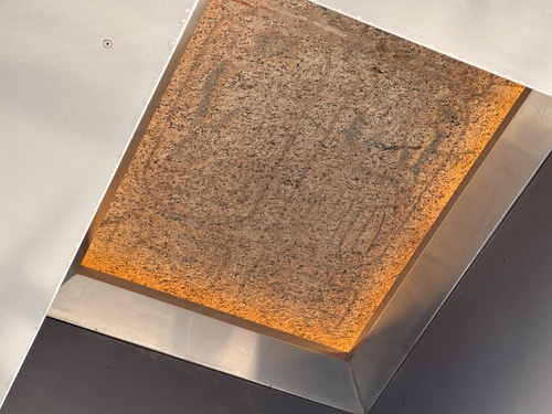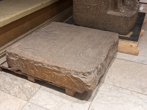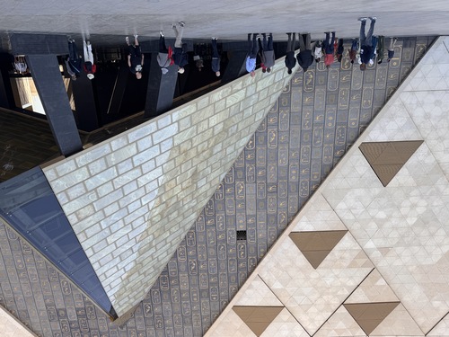박물관 건물로 입장하는 입구. 파라오의 이름인 카르튜스를 잔뜩 적어놓은 곳 사이로 피라미드 형태의 틈이 열리는 게 흥미로웠다. 이쪽과 반대쪽 모두 이런 형태였는데, 로비가 문으로 완전히 폐쇄되지 않고 외부와 연결된 오픈 스페이스라는 것이 흥미로웠다. 이집트 기후니까 가능한 구조라는 생각도.