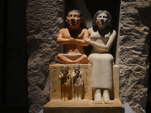 드디어 마주한 스네프루 왕. 다슈르 굴절 피라미드에서 발견된 석회암 조각상. 상이집트의 관을 쓰고 있고, 벨트에 스네프루의 카르트슈가 적혀있다.