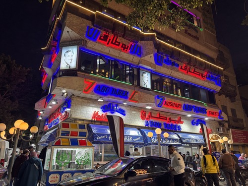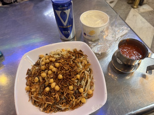 이집트 콜라와 함께 맛본 코샤리는 생각한 그대로의 토마토 파스타였다. 혼자 앉을 자리가 없어 고생했는데, 푸근한 인상의 아주머니께서 8명의 대가족 자리에서 한 틈을 내어주셔 금방 앉을 수 있었다. 가족 중 유일하게 영어를 할 수 있는 아드님과 이런저런 얘기를 하며 한 그릇을 뚝딱했다. 코샤리 한 그릇, 콜라, 쌀 디저트까지 모두 포함해 한국 돈 3천 원.
