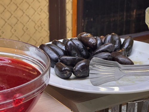 조식으로 나온 정체불명의 포도알. 식감이 바나나처럼 결이 살아있어, 이게 도대체 무슨 과일인지 의문이었다. 서버에게 물어보니 데이츠, 대추야자라 한다. 건조하지 않은 생 대추야자를 먹어보는 게 처음이라 무척 낯설었다.