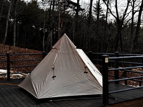 중앙의 폴대 하나로 서있는 인디언 텐트. 바람이 많이 불지 않아 생각보다 단단히 고정되어 좋았다.